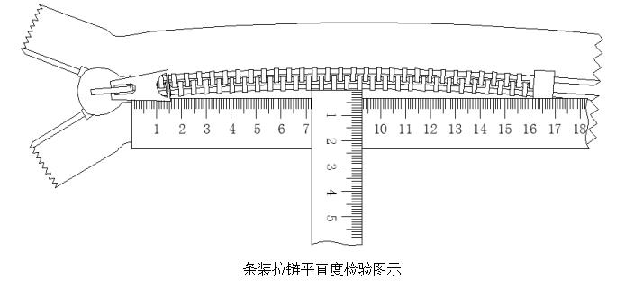 將成品拉鏈平放在平整的平臺上,使其處于拉合的自然狀態,然后進行測量如下圖: