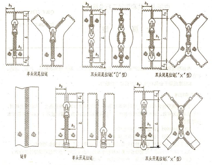 1.1、拉鏈按型式分為條裝拉鏈和碼裝鏈帶:條狀拉鏈可分為開尾拉鏈和閉尾拉鏈;開尾拉鏈又分為單開尾拉鏈和雙開尾拉鏈;閉尾拉鏈可分為單頭閉尾拉鏈和雙頭閉尾拉鏈;雙頭閉尾拉鏈可分為: