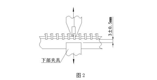 16.2.1.2、夾具主要尺寸:上夾具采用卡口插入夾具,頭部折彎 90°,長度約 10mm 滿足插座寬度要求;縱向卡住插座的插管和底座之間,下夾具寬 25mm,夾緊面齒形夾角 60°,節距 1.5mm,齒頂寬 0.2mm;兩片嚙合夾緊口到內齒 3mm 處加工成低于齒面 0.5mm 的平面。。