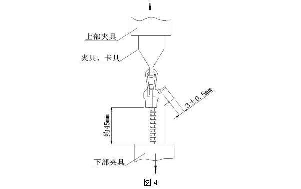 取長度大于 50mm 帶拉頭和上止的拉鏈單邊鏈帶樣本一段,將拉鏈的非上止端垂直裝夾在下夾具上,將拉片垂直掛在上夾具掛鉤上或者將拉頭拉片垂直裝夾在上夾具中(如圖 4)。啟動測試儀,測試至拉鏈破損或者拉頭拉脫為止,此時的強力即為單邊上止強力,采用多次測量取有效范圍值。