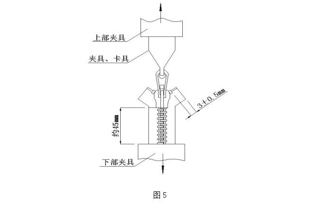 取長度大于 50mm 帶拉頭和上止的拉鏈樣本一段,將拉鏈的非上止端垂直裝夾在下夾具上,將拉片垂直掛在上夾具掛鉤上或者將拉頭拉片垂直裝夾在上夾具中(如圖 5)。啟動測試儀,測試至拉鏈破損或者拉頭拉脫為止,此時的強力即為上止強力,采用多次測量取有效范圍值。