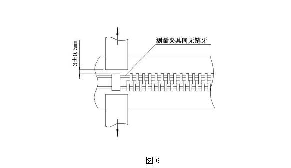 取長度大于 50mm 的閉尾拉鏈樣本一段,將下止以上的咪牙去除掉 3~4 粒后裝夾在上述夾具中, 裝夾時應將下止對準夾具的中間部位,下止和夾具的夾口部位對齊緊靠(如圖 6)。啟動測試儀,測試至下止變形松動、脫落或者布帶破損為止,此時顯示的最大數值即為碼裝的平拉強力值,采取多次測試取有效范圍值。