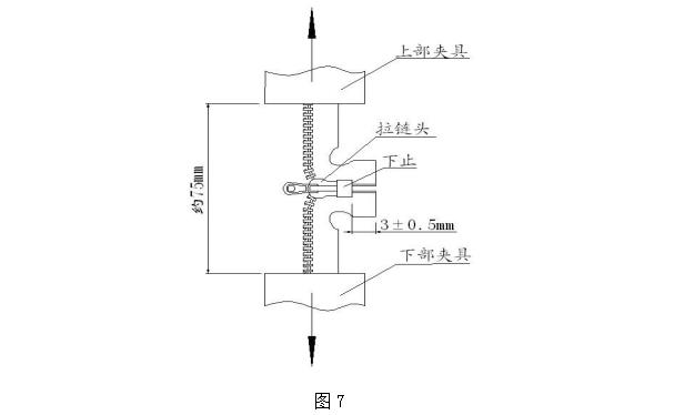 取長度約 50mm 帶拉頭(自鎖頭應先排除自鎖功能)及下止的拉鏈樣本一段,將拉頭拉至下止(拉片翻起),兩帶筋分別裝夾于上下夾具間(先去掉一段約 10mm 的鏈牙),夾具距離約 75mm(如圖 7)。啟動測試儀,測試至拉鏈破損為止,此時的強力值即為下止強力,采用多次測試取有效范圍值。