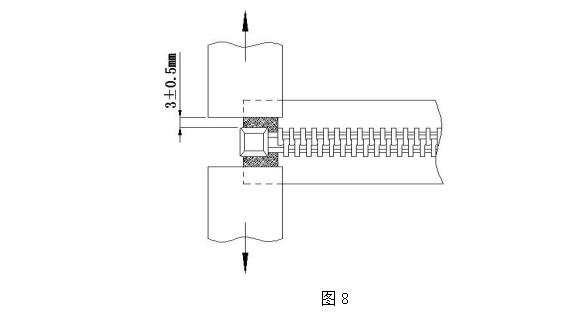 取長度大于 50mm 帶分開件的拉鏈樣本一段,將分開件處裝夾在上述夾具中。裝夾時夾具邊緣必須與插銷的內側端(即靠近鏈牙一端)成一直線,夾口靠緊插銷插座(如圖 8)。啟動測試儀器,測試至分開件相互脫離或者布帶破損為止,此時的強力值即為拉鏈開尾平拉強力,采用多次測試取有效范圍值。