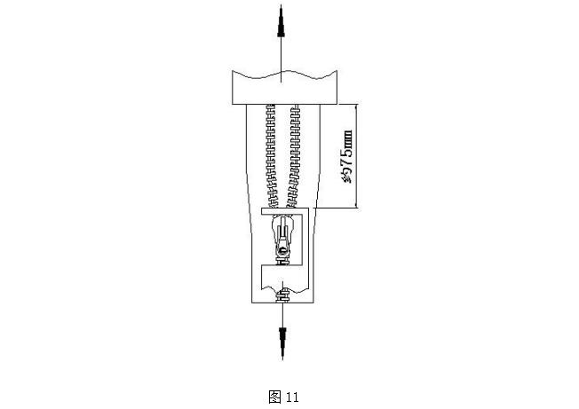取長(zhǎng)度大于 100mm 帶自鎖拉頭拉鏈樣本一段,拉頭拉至中間位置,分開兩邊鏈帶分別夾于上下夾具中(先去掉一段約 10mm 的鏈牙),夾具距離約 75mm(如圖 10),啟動(dòng)測(cè)試儀器,測(cè)試至拉頭滑脫或拉鏈破損為止,此時(shí)的強(qiáng)力值即為拉頭自鎖強(qiáng)力,采用多次測(cè)試取有效范圍值。