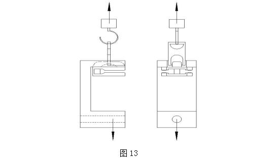 取成品拉頭一個(gè),將拉頭拉片立起掛入上夾具掛鉤中,拉頭本體除蓋帽和拉片橫梁部位外卡入拉頭槽中(如圖 13)。啟動(dòng)測(cè)試儀器,測(cè)試直至拉片斷裂或者拉頭蓋帽崩裂為止,此時(shí)的強(qiáng)力值即為拉頭拉片結(jié)合強(qiáng)力值,采用多次測(cè)量取有效范圍值。