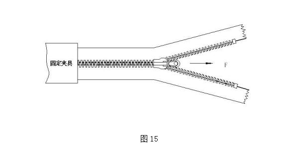 取成品拉鏈一條,任取 200mm 長(zhǎng)度(長(zhǎng)度小于 200mm 的按實(shí)際長(zhǎng)度),用手往復(fù)拉動(dòng)三次,然后以拉開狀態(tài)置于工作臺(tái)上,分開端用手推平,另一端裝夾在固定夾具中,拉片套在移位夾具上(如圖 15)。啟動(dòng)測(cè)試儀拉合拉鏈至定點(diǎn)位置,在此移動(dòng)過程中,記錄的最大拉力值即為拉鏈的拉合輕滑度。